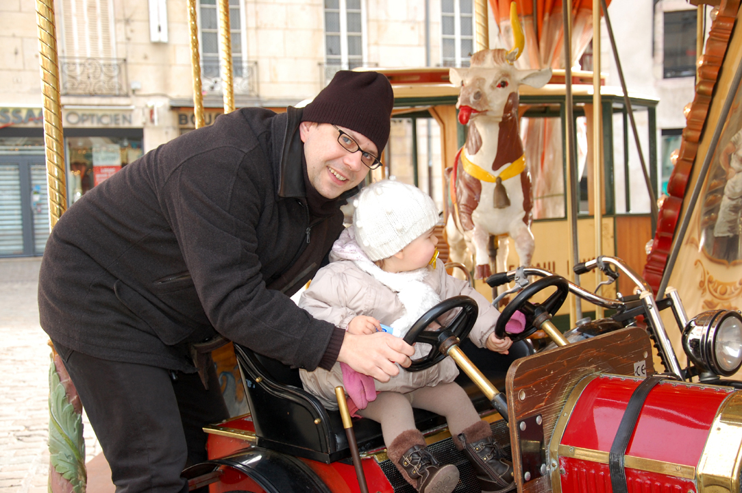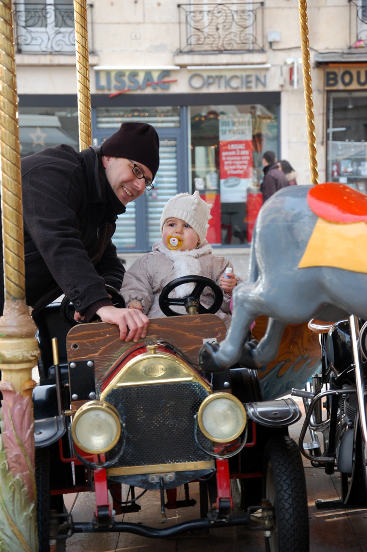 Cet après midi, nous avons été nous ballader en ville. J’ai fait du manège pour la première fois. Malgré le fait que mon Papa était avec moi, j’ai quand même eu peur.