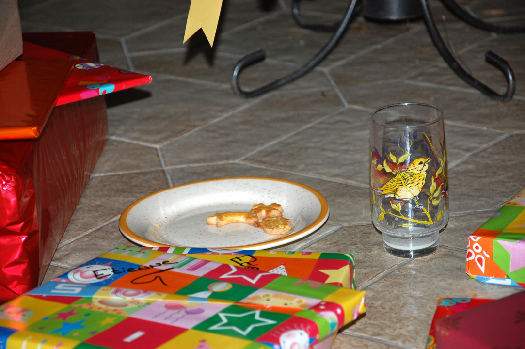Cette nuit, le Père Noël est passé, et il a bu tout son lait et mangé presque tous les gâteaux.