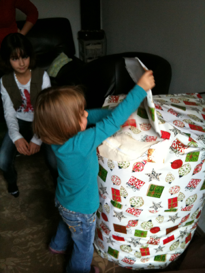 Aujourd’hui, direction Auxerre, chez Jessica, Bertrand et Clémence pour fêter notre traditionnel repas de Noël. A peine arrivée, j’ai reçu un cadeau : un gros pouf qui va bien dans ma chambre !